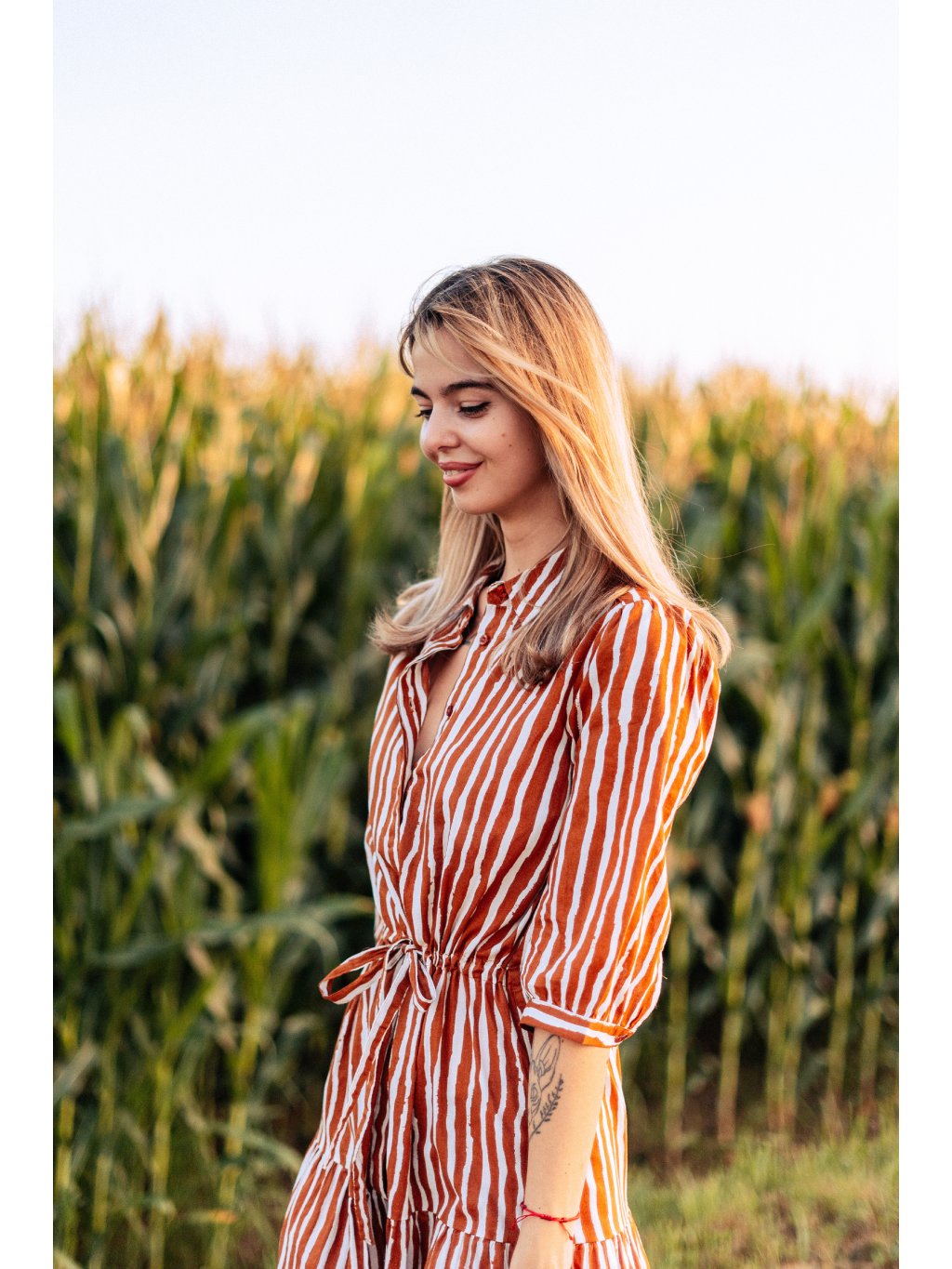 Krásne dlhé letné šaty s golierom, mierne dlhšími rukávmi a pruhovanou potlačou. Je možné si ich vďaka vloženej opaskovej šnúrke utiahnuť podľa vlastných preferencií.